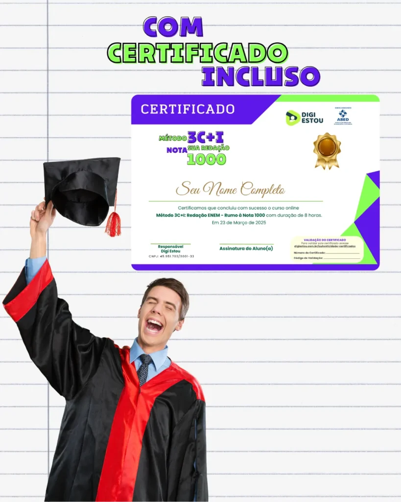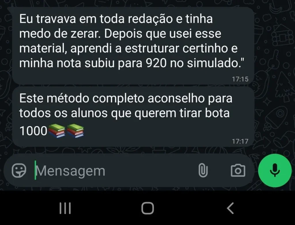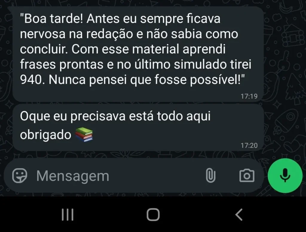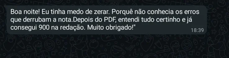 😁É prático e diferente, desenhado para transformar sua hora de prova em um ciclo eficiente de leitura, planejamento e escrita, alinhado às 5 competências oficiais É menos sobre 'decoreba' e mais sobre estratégia.