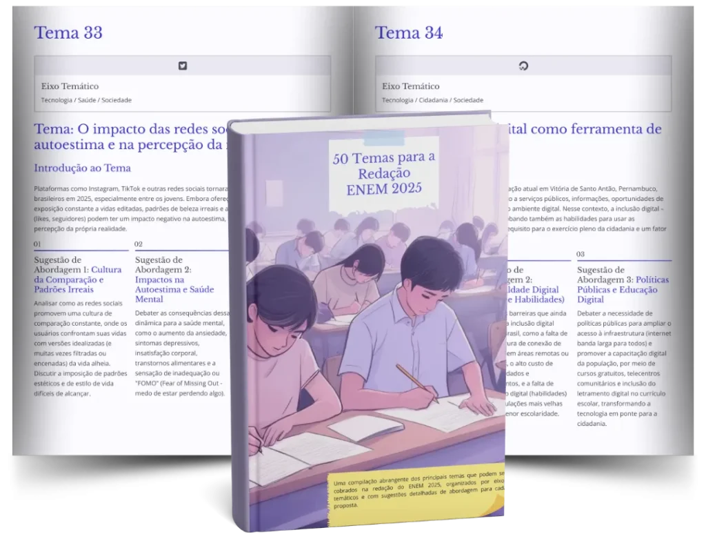 🎁 Bônus 1: 50 Temas Quentes para o ENEM 2025 - Uma compilação abrangente dos principais temas que podem ser cobrados na redação do ENEM 2025, organizados por eixos temáticos e com sugestões detalhadas de abordagem para cada proposta